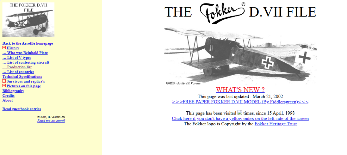 I started the Fokker D.VII file in 1997 as a website on Tripod (now Lycos). I wanted to learn about making websites (in HTML using Netscape Navigator) and was interested in the Fokker D.VII, which I regard the best fighter of the First World War. At that time, there was not much information online.